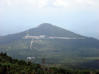 | 11時30分、駐車場に到着。車の数は100台以上になっていた。 振り返ると山頂は雲の中だった。 |
