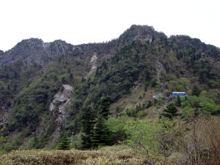 天狗岳からの弥山。青い建物が3の鎖場 |