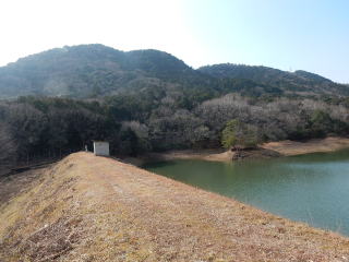 | 二重の獣避け扉を出ると、左手に「明治池」の石標がある溜池があった。堰堤から五峰山を見上げる。 | |