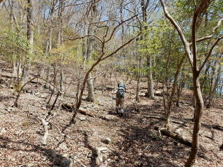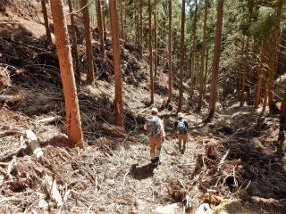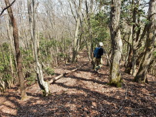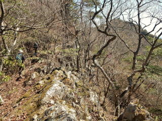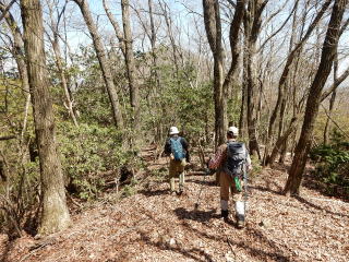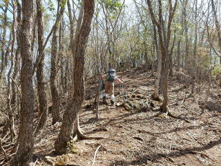 | 12時5分:雨石山を出発。 595mPKまでは緩やかなみちだったが、小野峠への下りはルート不明瞭な激下りになったので慎重に下降。 |