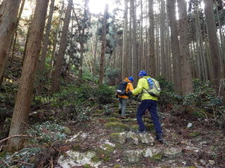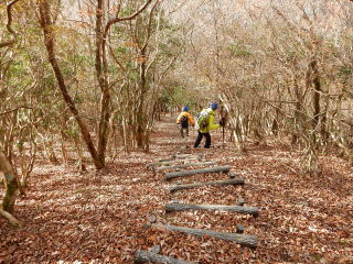 14時15分:下山開始。15分ほど歩くと、長い擬木階段が現れる。
