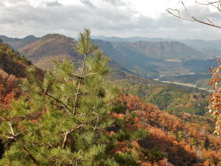 大岩の間から覗くと、東側には京都府の山並みが連なり、目の前には三嶽が対峙している。
