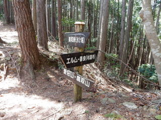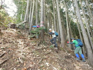 | 直進すれば美和峠に向かうが、関電標識に従って右折して鉄塔巡視路を登る。 しばらく急登が続く。落ち葉で滑りやすいので、お助けロープが頼りになります。 |