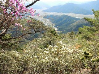 | 山頂はヒカゲツツジの花に囲まれ、その向こうに町並みも見渡せる。 | |