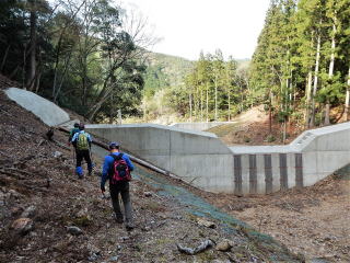 | 沢沿いまで下ると砂防ダム工事中で、登山道が無くなっていた。 | |