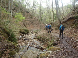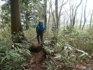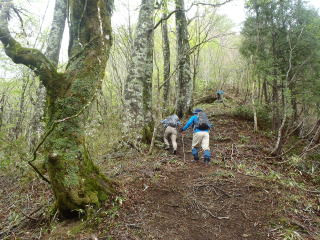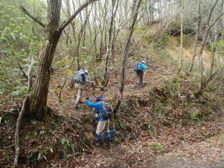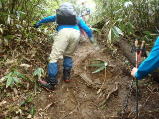 | 丸山山頂直下のぬかるみがこの日の核心部。滑りまくって皆さんのズボンは泥だらけになっていた。 | |