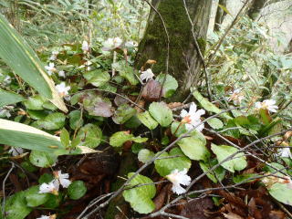 | 前日の降雨で滑りやすい道を登っていくと、ポツポツとイワウチワが現れ始める。 | |