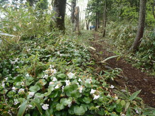 | 丸山山頂を過ぎると、イワウチワの群落が次々に現れる。 | |