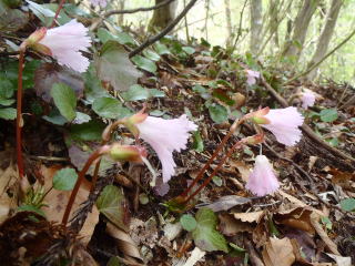 | 笹の道に入るとすぐにイワウチワが出迎えてくれ、少し下ると群生地。 | |