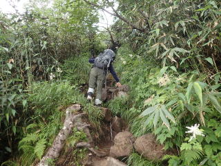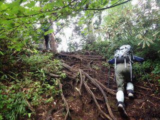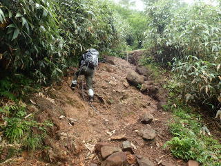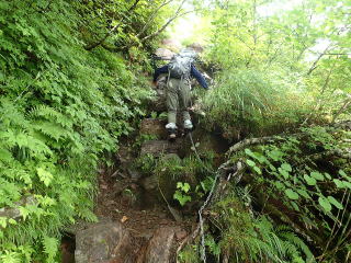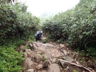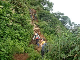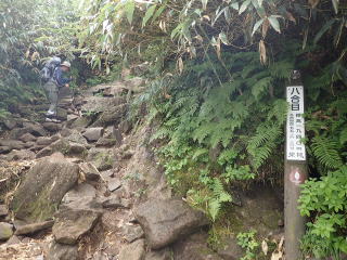 6合目手前で鎖場が現れ、ここから8合目までは胸突き八丁の急坂道が続く。