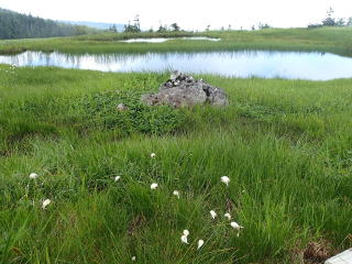 山頂標識前の展望地からワタスゲが咲き乱れる湿原を望む。