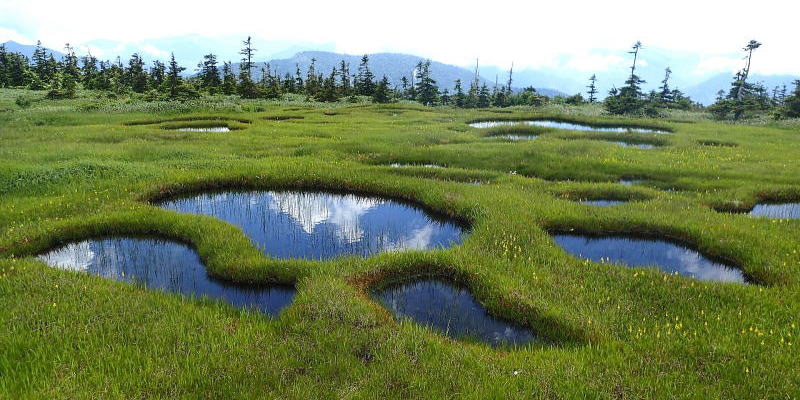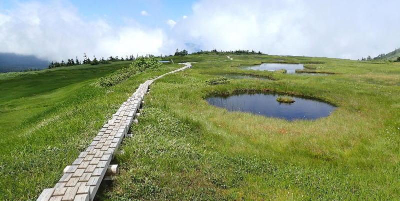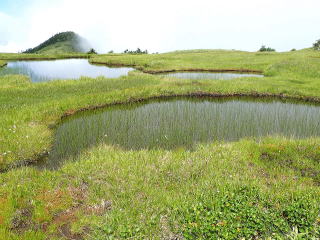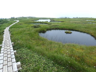 苗代のような池塘の周りにはワタスゲが咲き誇り、天空の楽園のよう。