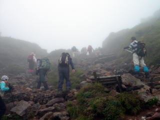 | 湯布院温泉に宿泊し、今日は由布岳へ。 昨日は久住山から湯布院に向かう途中、由布岳 が綺麗に見えた。 今日はあいにくの天気で頂上は雲に覆われて見え ない。 8時45分:登山口を出発。 |