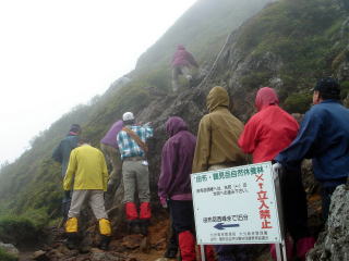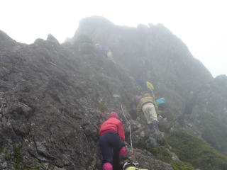 | 11時15分:続いて三角点のある西峰へ。 | 強風の中の鎖場は足がすくむ。 |