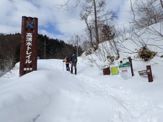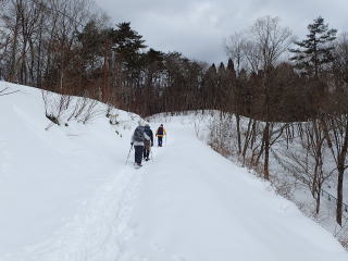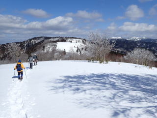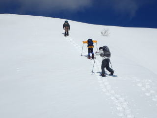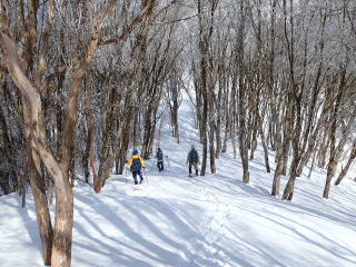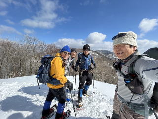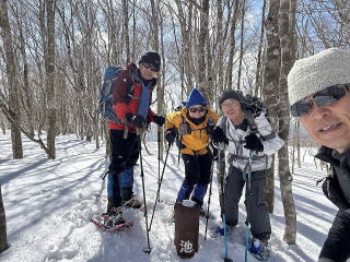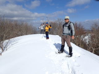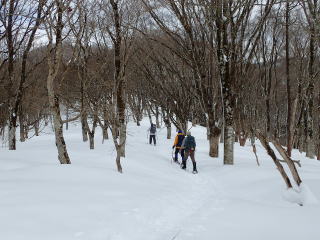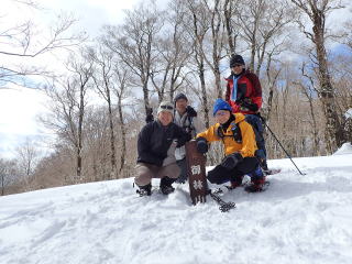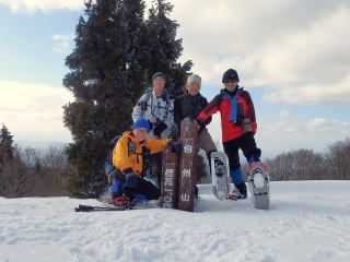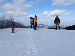 | 同行者は、IM君、TR君とFM君。 9時30分:人形峠駐車場を出発し、登山口からスノーシューを装着して登り始める。 |