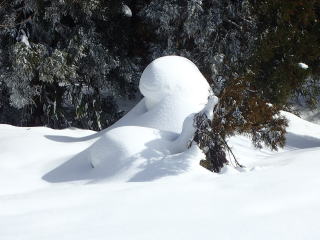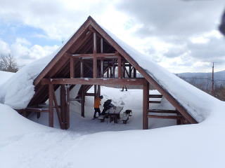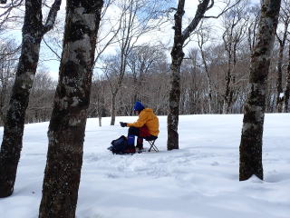 | 14時20分:霧ヶ原。座り込んだ雪だるまさんを見ながら、しばしティータイム。 | |