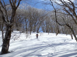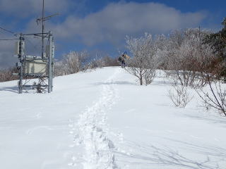 | 次のピークである御林山に向かうと、この辺りの樹々には薄っすらと霧氷がついていた。 | |