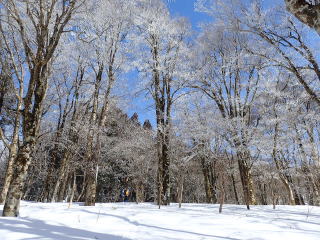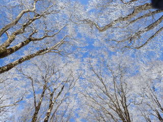 | 青空が広がり、見上げると霧氷の樹々が華やか。 | |