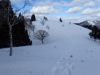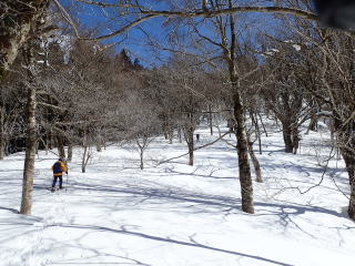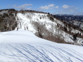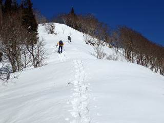 | 池川山が近づくと広い雪原が続く。GPSがないと方向を間違いそうだ。 | |