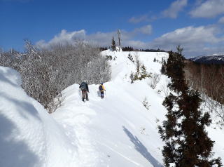 | 平坦な雪原は丸山分岐まで続き、分岐を過ぎると一転して痩せ尾根になる。 | |