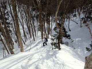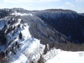 | 雪のついた痩せ尾根を、歩けるところを探りながら進んでいく。 足を滑らせると谷に転落するので、この日一番緊張を強いられたところだった。 |