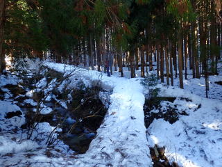 まず、沢に架かった橋を渡り、沢沿いに登っていく。
