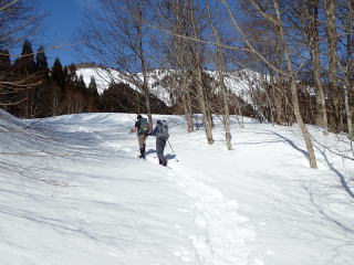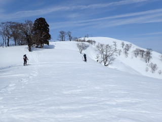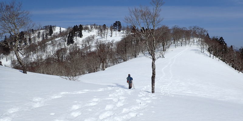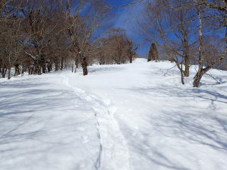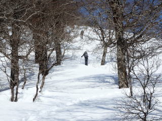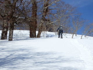 風格のあるブナの古木帯を見ながら気持ちのいい雪原を歩き、少しずつ標高を上げていく。。