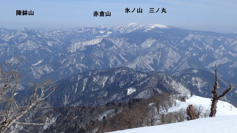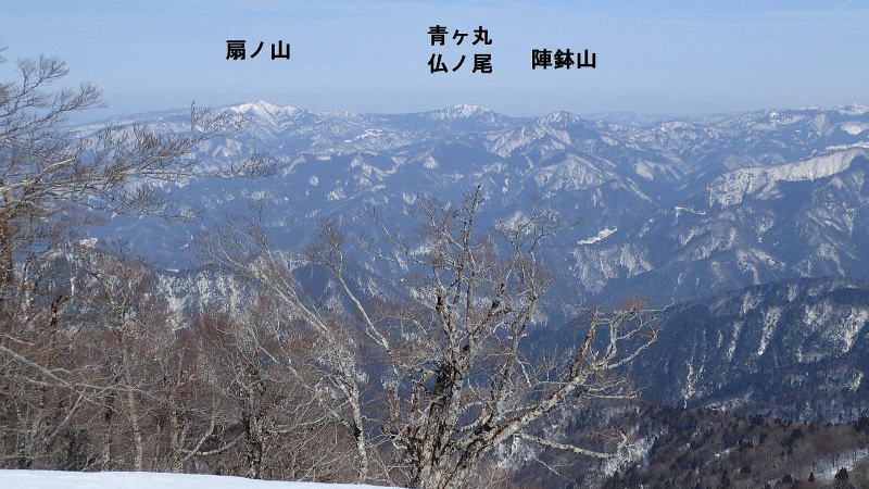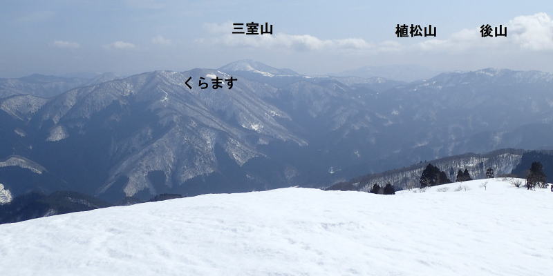 山頂は風があるので、東側斜面を少し下って扇ノ山から氷ノ山の山並みが一望できる