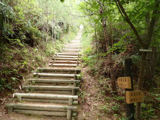 | 山頂への直登ルートはこの長い木段。 9時:山頂広場に上がる。 | |||