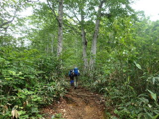 | 会津駒ヶ岳は、13年前の6月に登った山だ。 その時は残雪が多く、中腹から上はほとんど雪に埋もれていて、駒大池も雪の中だった。 雪解け後の花の季節にもう一度訪れることができれはいいなと、秘かに思っていたこの山に今回再訪 することができたのは、約800qの道のりを交代でハンドルを握ってくれた同行のIM君とTR君のお陰です。 16日朝4時に高砂を出発し、午後3時に予約していた見通りキャンプ場に到着。 関越道魚沼インターから国道252号(酷道と言われてるらしいが)を通ってきたので予定より1時間早く到着 でき、バンガローでゆっくりと体を休めることができた。 翌朝は7時前に滝沢登山口駐車場に到着。平日のため先行車は3台だった。 |