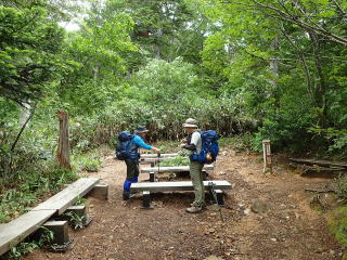 | 11時:休憩テラスに到着。昨日の天気予報では小雨模様だったが、幸い雨は降らず見晴らしもいい。 会津駒ヶ岳山頂と大戸沢岳を見ながら、ゆっくりとランチタイムを楽しむことができた。(11時50分:出発) |