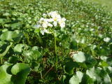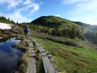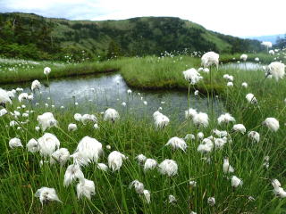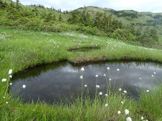 | 木道を少し登ると池塘が出現。ここは13年前には雪に埋もれていたはずだ。しかも、ワタスゲが華やか。 | |||