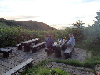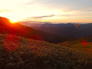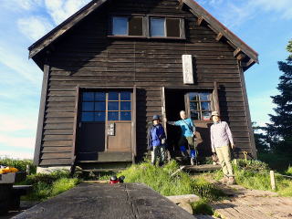 | 18日朝4時40分、ご来光は那須連峰左手から。 朝食も小屋前のベンチでいただく。 | |||