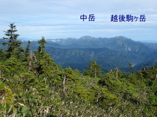 | 6時30分:会津駒ヶ岳山頂。中門岳方向へ足を向けると、越後駒ヶ岳が姿を現す(八海山は真ん中にチョコッと)。 | |||