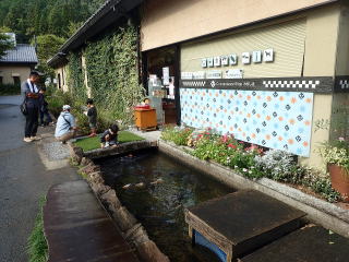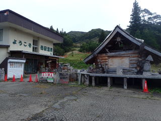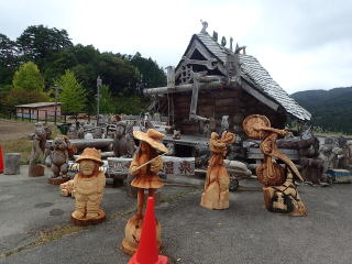 | 11時30分:母袋温泉に下山。入口にはチェーンソーアートが展示されていて、管理の方によると 絵本の中のような建物と展示は3年前にからはじめ、新しい彫り物は今年の作品とのことだった。 |