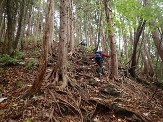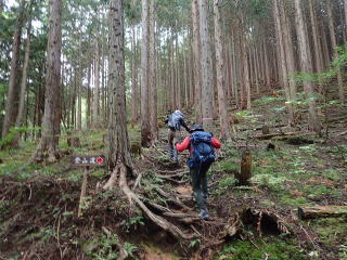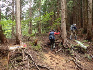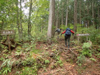 | 7時35分:登山口。ここから暫くは檜の根っこ道になる。ちょっと歩きにくい。 | |||