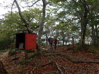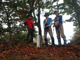| 9時15分:山頂に到着。樹々に隙間があるが、残念ながらガスが広がった来て眺望は閉ざされていた。 先行の2人連れの方はすでに下山し、静かな山頂で暫くティータイムを楽しんでから下山。 |