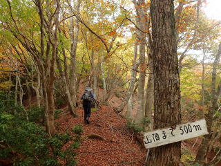 | 10時30分:「山頂まで1000m」の標識。アプリを開くと標高は約450m地点。 | |