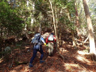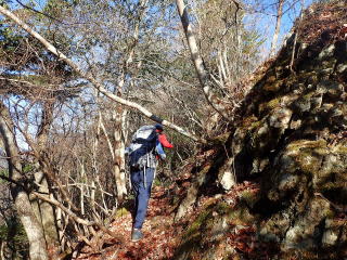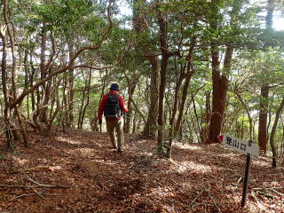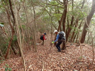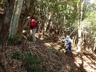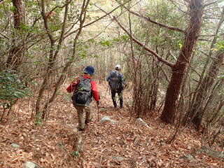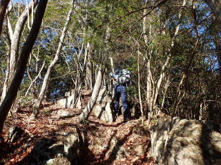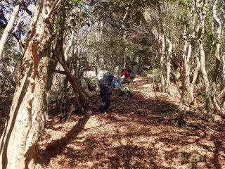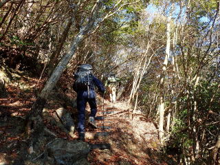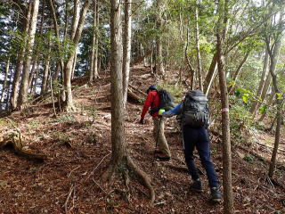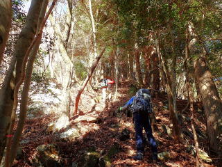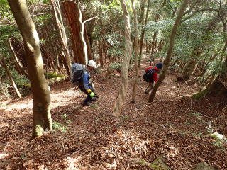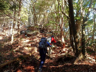 | 13時10分:東尾根から下山開始。落葉でフワフワになった急坂を下る。気持ちいい。 | |