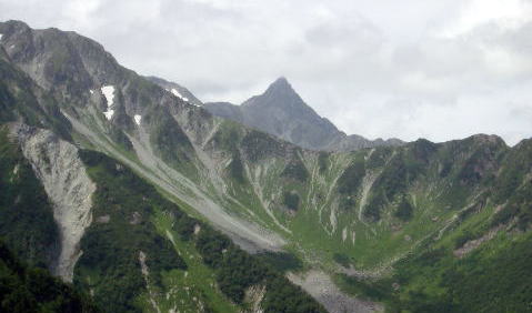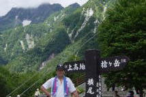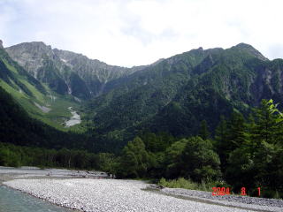 | 山の仲間との夏山登山で憧れの奥穂高に登った。 梅雨明けのベストシーズンで、天気は最高。絵葉書の世界を踏みしめることができた。 朝7時:上高地を出発。 梓川沿いを歩いていくとまず明神岳が見えた。 |