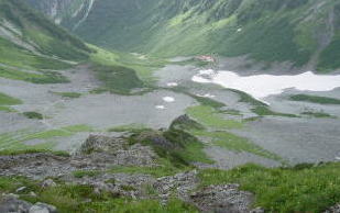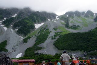 | 涸沢に向かって下山。 途中でガスが晴れ雄大な涸沢の景色が眼下に広がった。 | |