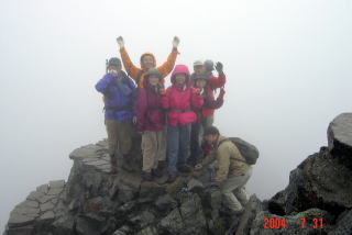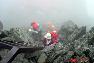 | 8時:奥穂高岳頂上に立つ。残念ながらガスで景色が全く見えない。 | |