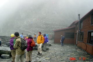 | 翌朝は5時に奥穂高岳頂上へ向けて出発。 7時:穂高岳山荘。ガスの中で肌寒い。 |