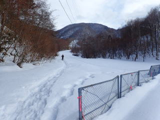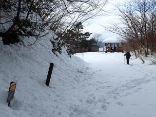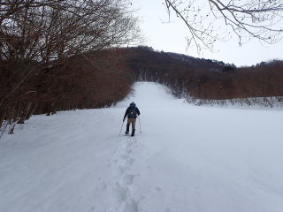 | 5〜6分歩くとスキー場に入り、休業中で静まりかえったゲレンデを登っていく。 | |