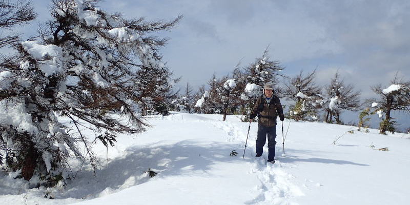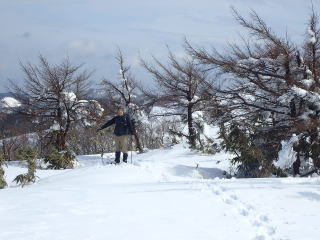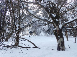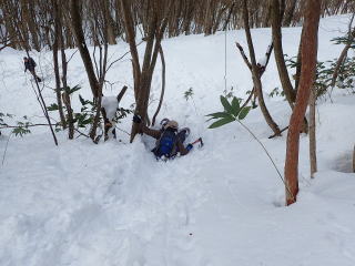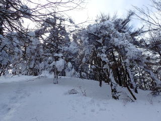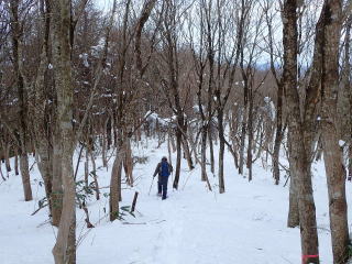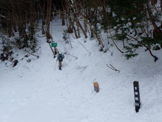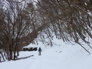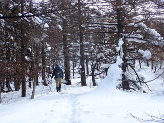 | 標高約1030m辺りまで薄暗い檜林の道が続き、時折頭上から落下してくる雪爆弾が怖い。 | |